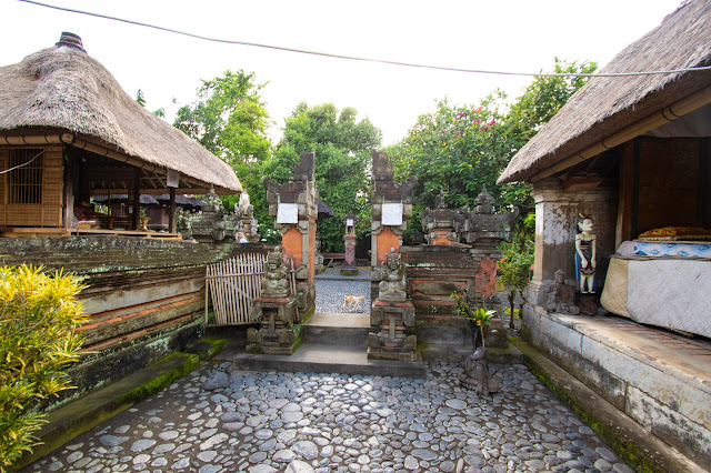 Come prima cosa andremo a visitare una tipica casa balinese. Ci spostiamo a Desa Batuan. Per prima cosa ci viene spiegata l'insegna all'esterno della casa col nome della famiglia e con l'indicazione anche del numero dei membri della famiglia risultanti dall'ultimo censimento. I bambini fino ad una certa età non sono indicati. All'interno troviamo le persone indaffarate in diverse attività. Due donne si occupano del cibo, quindi una di loro prepara un tipico "pane" balinese, dalla forma cilindrica a base di riso che taglia a fette sottilissime e che andrebbe poi cotto velocemente. A noi lo fa provare così al naturale e devo dire che è molto buono! Una donna più anziana invece sta preparando una sorta di gallette di riso. Prende la giusta quantità e la mette negli stampini. Un altro signore invece ha preparato il pastone per le galline e lo distribuisce nelle gabbie. Praticamente questa casa è una piccola comunità. Un altro nucleo familiare accudisce un bambino piccolo. Non manca la zona interna col tempietto privato. Sinceramente non capiamo se è vita quotidiana o se comunque è anche una mezza messa in scena per i turisti. Alla fine infatti vediamo la guida lasciare dei soldi alla famiglia. Bella anche la cucina col fuoco acceso ed il profumo del legno che brucia.