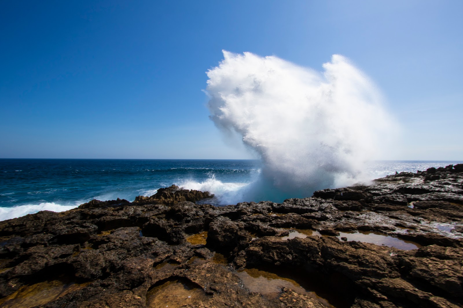 Quindi ci spostiamo per andare a vedere due attrattive dell'isola. La prima è Devil's tears. Si tratta di una scogliera a picco sul mare sulla quale si infrangono con potenza notevole le onde enormi dell'oceano. Poi dalla cavità viene spruzzata fuori dell'acqua che va a formare un arcobaleno.Inoltre ci si può spostare lungo la scogliera per andare ad ammirare le onde che si infrangono in altri punti, facendo sempre attenzione perché ne arrivano di potenza notevole!