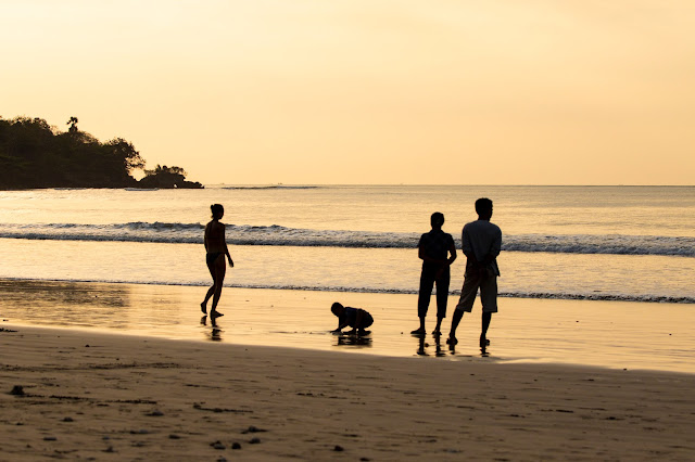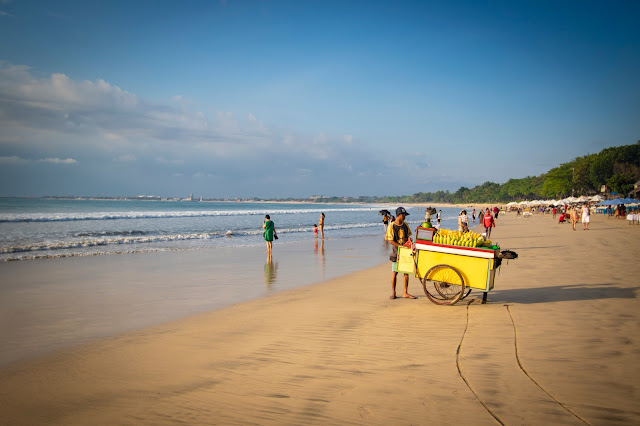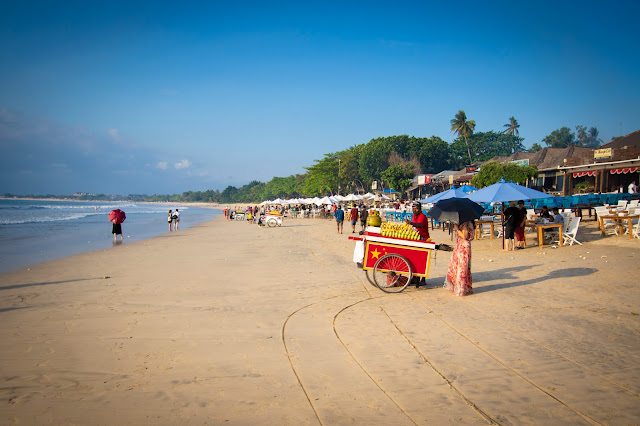 Vogliamo andare sulla spiaggia di Jimbaran, così prendiamo i teli alle piscine ed in pochi minuti ci siamo.E' una spiaggia enorme, larga e lunga. Non ci sono tante persone a mare, ma tanti semplicemente passeggiano o si rilassano sulla spiaggia. Non mancano i surfisti.